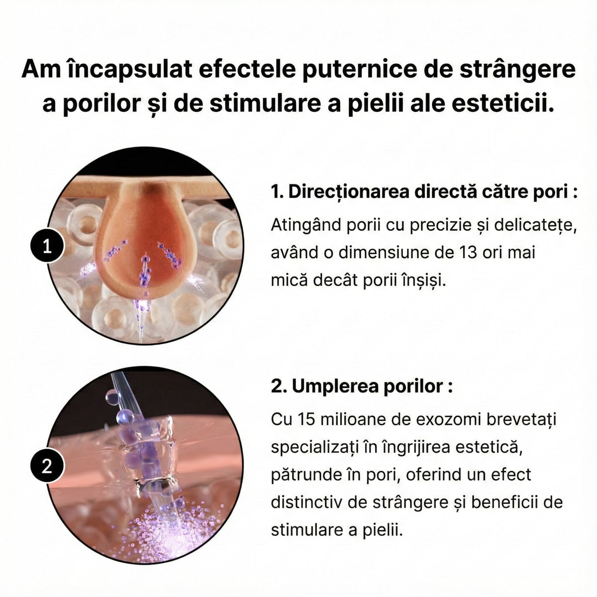 Îngrijire avansată cu exozomi și micro-ace care pătrund în profunzime pentru transportul eficient al ingredientelor active. Combate porii dilatați și redă vitalitatea pielii.